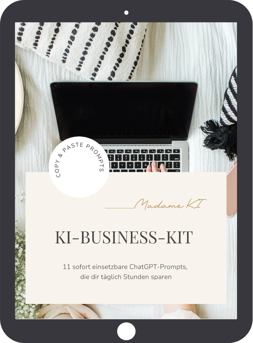 Deine Daten sind sicher. Du kannst dich jederzeit mit einem Klick wieder abmelden. Mit deiner Anmeldung trägst du dich auf die Warteliste ein und erhältst außerdem regelmäßig E-Mails mit Tipps, News und exklusiven Updates von Madame KI. Du kannst dich jederzeit über den Link in den E-Mails wieder abmelden. Mehr dazu in meiner Datenschutzerklärung.