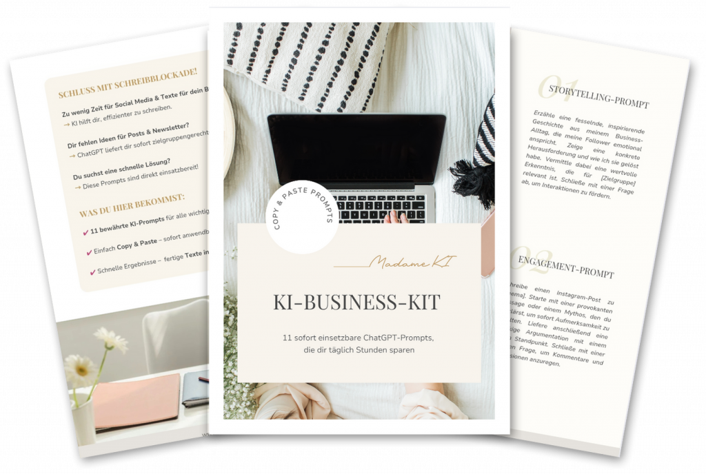 Im KI-Business-Kit bekommst du 11 fertige ChatGPT-Vorlagen (Prompts), die dir perfekte Inhalte für Social Media, Newsletter & Co. liefern – einfach in ChatGPT einfügen, anpassen & los geht’s!